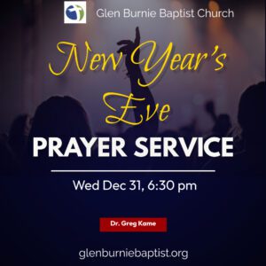 Join us on Wednesday December 31 for our New Year's Eve Prayer Service at 6:30 pm. Come and join us in this special prayer service as we ring in the New Year.