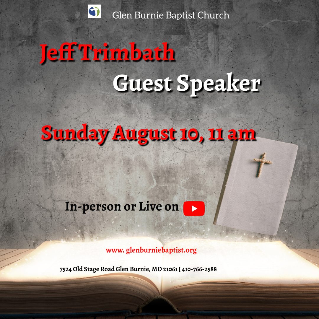 Join us on Sun August 10 as Jeff Trimbath will be our guest speaker. Come and hear God’s word be preached.